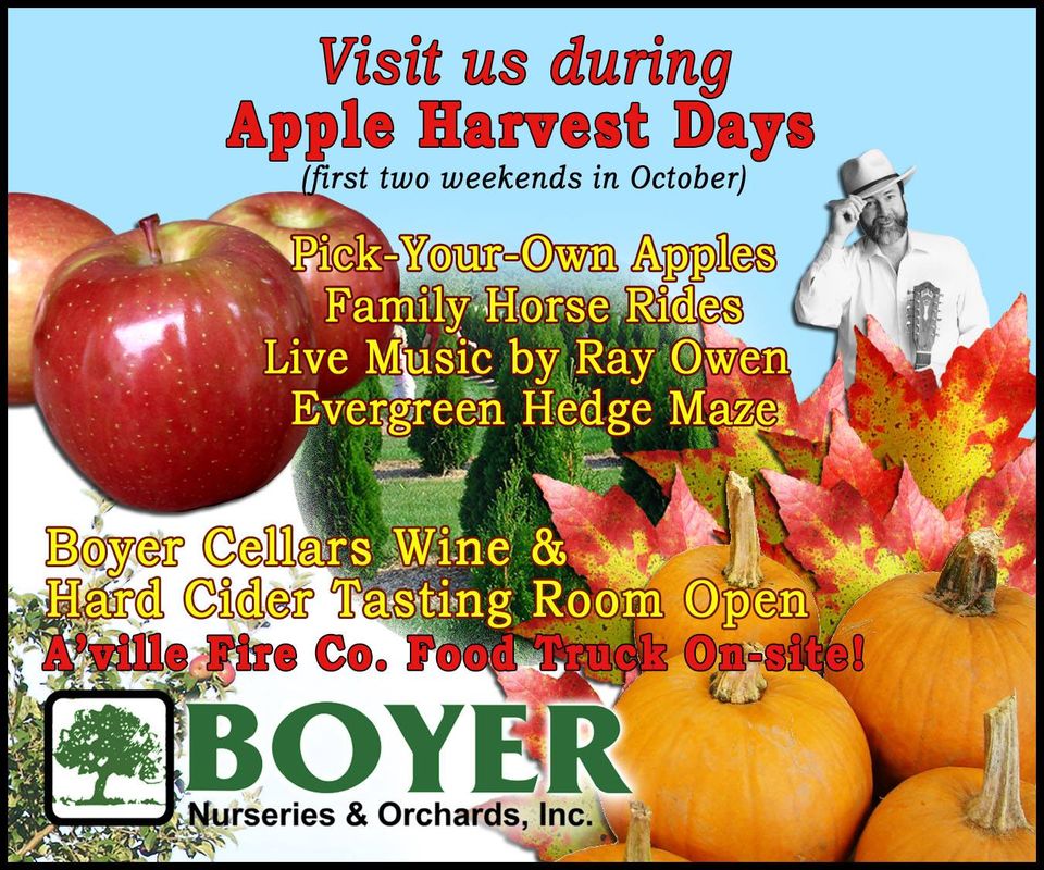 Celebrate the apple harvest season with Boyer Nurseries & Orchards the first two weekends of October! On October 3 and 4, and October 10 and 11, Boyer Nurseries & Orchards will offer pick your own apples, live music, horse rides, and the evergreen hedge maze will be open.